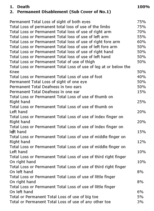 | Personal Accidental Death and Permanent Disability (benefits as per schedule) | 50,000 |