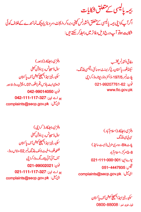 The Management Executive, Insurance Division, 3rd Floor, NIC Building, 62-Jinnah Avenue, Blue Area, Islamabad.